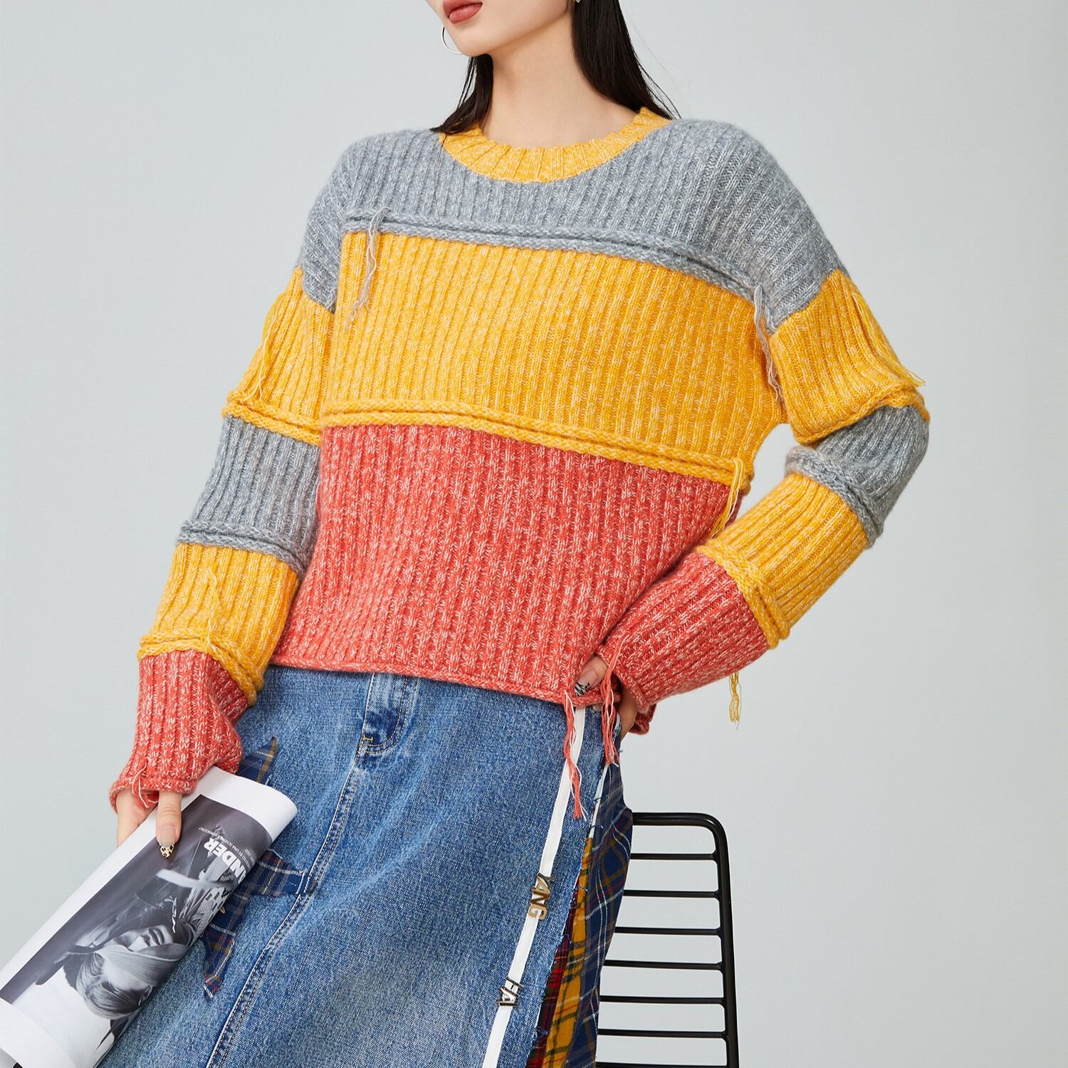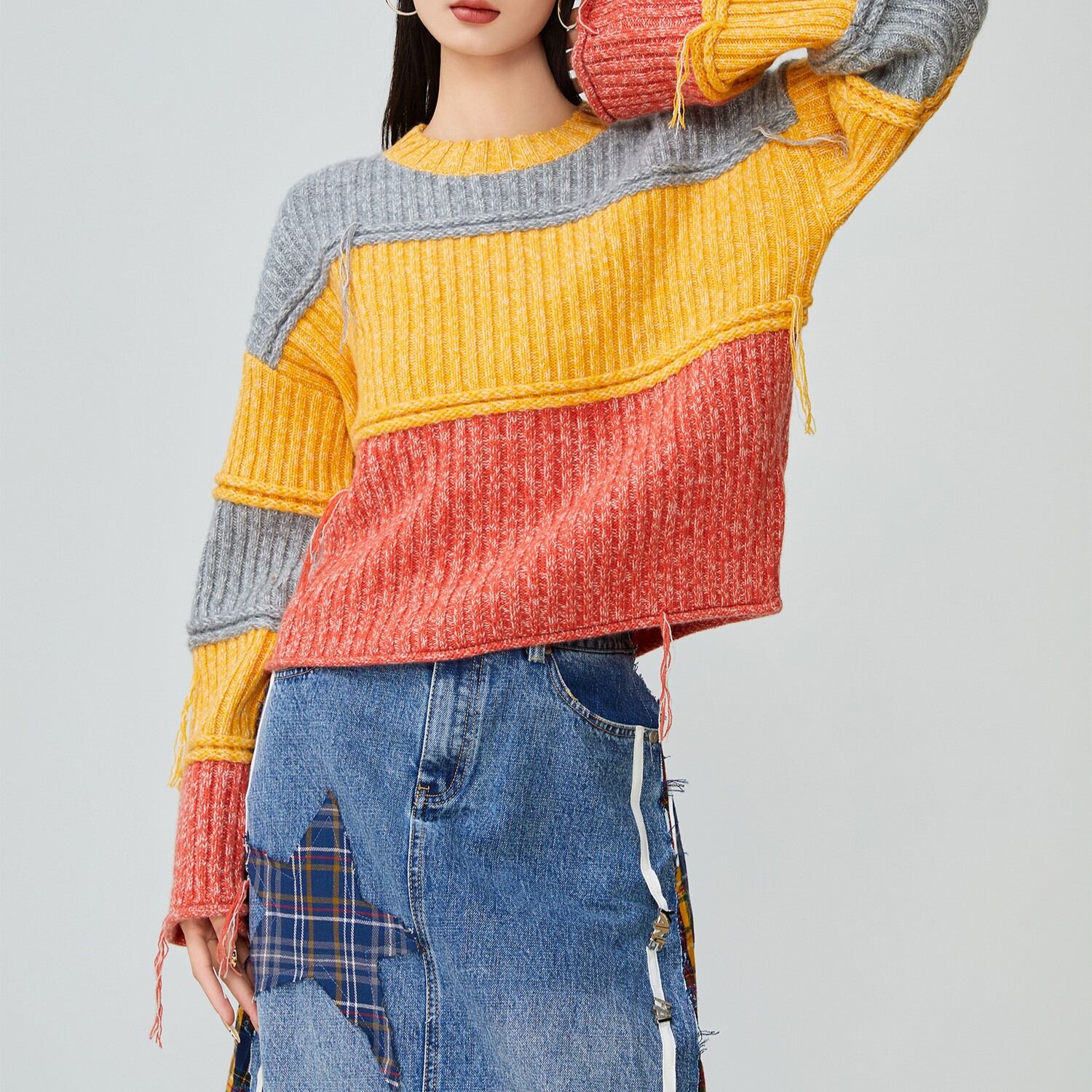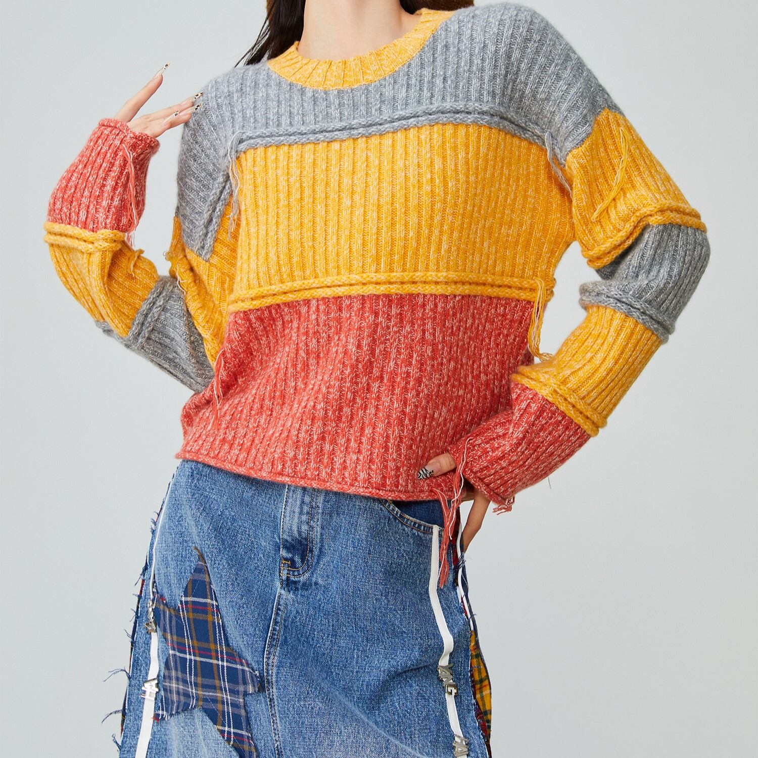 コーディネートの主役になる、カラーブロックデザインが魅力。 短丈なので、スタイルアップ効果も期待できます。 シンプルなボトムスと合わせて、ニットのデザインを引き立てるのがおすすめ。 ■サイズ (cm) S / 肩幅:30 胸囲:94 着丈:62 袖丈:41 M / 肩幅:31 胸囲:98 着丈:63 袖丈:42 L / 肩幅:32 胸囲:102 着丈:64 袖丈:43 XL / 肩幅:33 胸囲:106 着丈:65 袖丈:44 ※サイズ表記につき、約1~3cmの誤差がある場合がございます。 ■カラー グレー × イエロー × オレンジ ■素材 ポリエステル ◼お届けについて ご決済から発送まで1~3週間前後のお時間をいただいております。 (※商品の状況によっては、3週間以上かかる場合もございます。) ◼注意事項 ・タイミングによっては 商品在庫切れにより 注文キャンセルとさせていただく恐れもございますので、予めご了承くださいませ。 ・こちらは輸入品となります。日本製とは検品基準が異なる為、 新品未使用品でもごくわずかな汚れや ほつれがある場合もございます。 ・仕入れ工場を変えることがあるため、記載サイズと若干異なる場合がございます。 ・商品の色味は、お手持ちのスマートフォンの画面によって実物と若干異なる 場合がございます。 ・イメージ違いやサイズ交換等、お客さまご都合による交換、返品は対応出来かねます。 ———————————— ご注文前にご確認ください →https://official.lhery.com/about ————————————